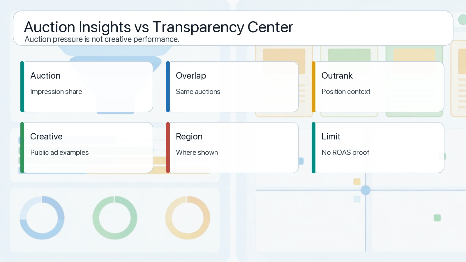 Google Ads Auction Insights is useful when you want to understand who overlaps with you in the auctions you entered. Google Ads Transparency Center is useful when you want to inspect public ads from verified advertisers across Google surfaces.