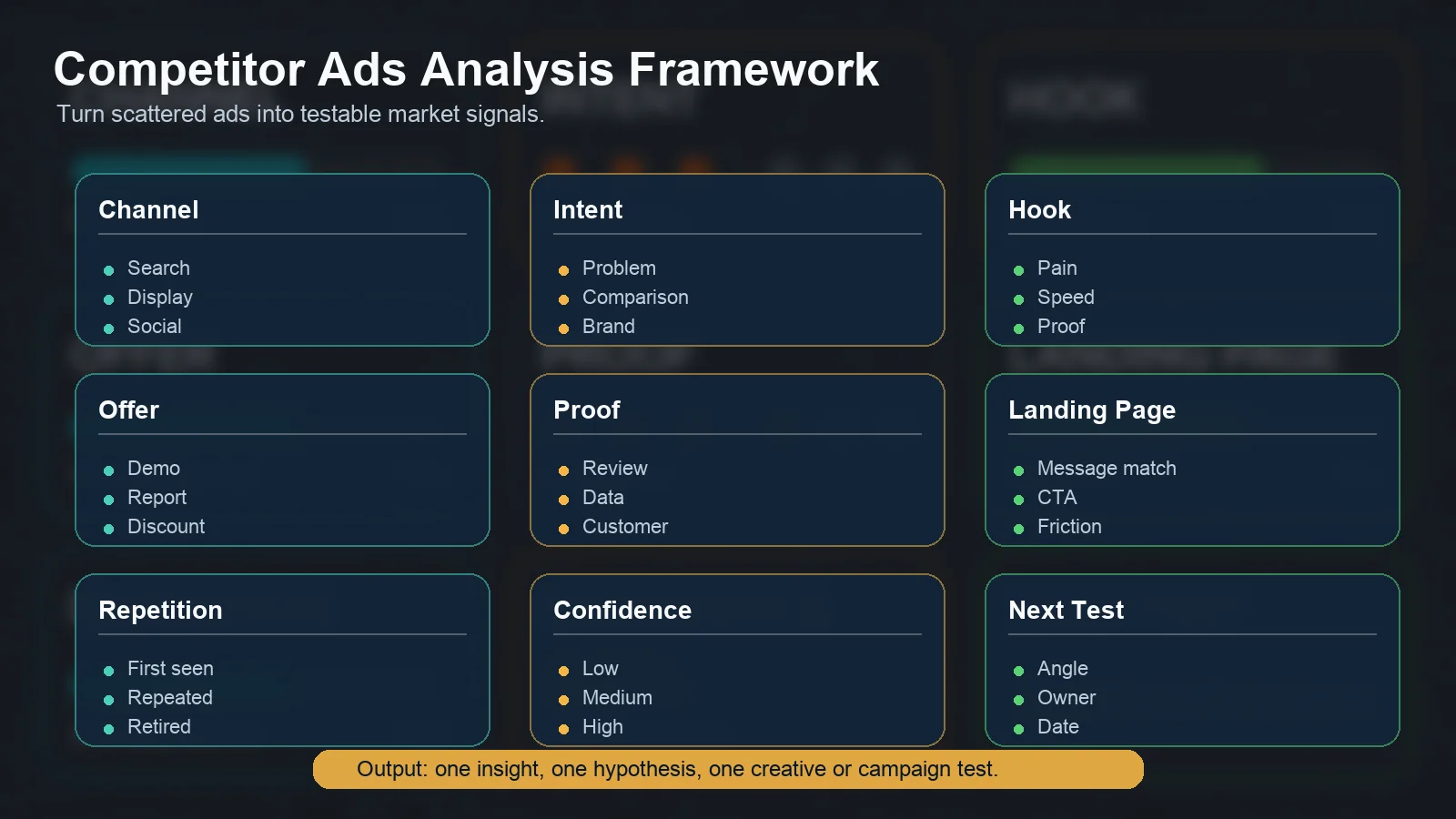 This structure matters because many teams collect competitor ads but never use them. A good system turns public evidence into better marketing decisions.