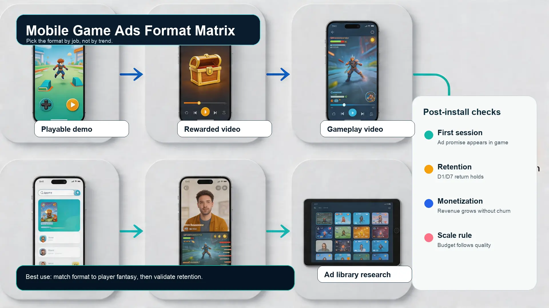 Good mobile game ads are not random creative swings. They are a system: research competitor patterns, choose the format that fits the player fantasy, pair the ad with the right channel and store assets, then scale only when post-install quality agrees with acquisition metrics.