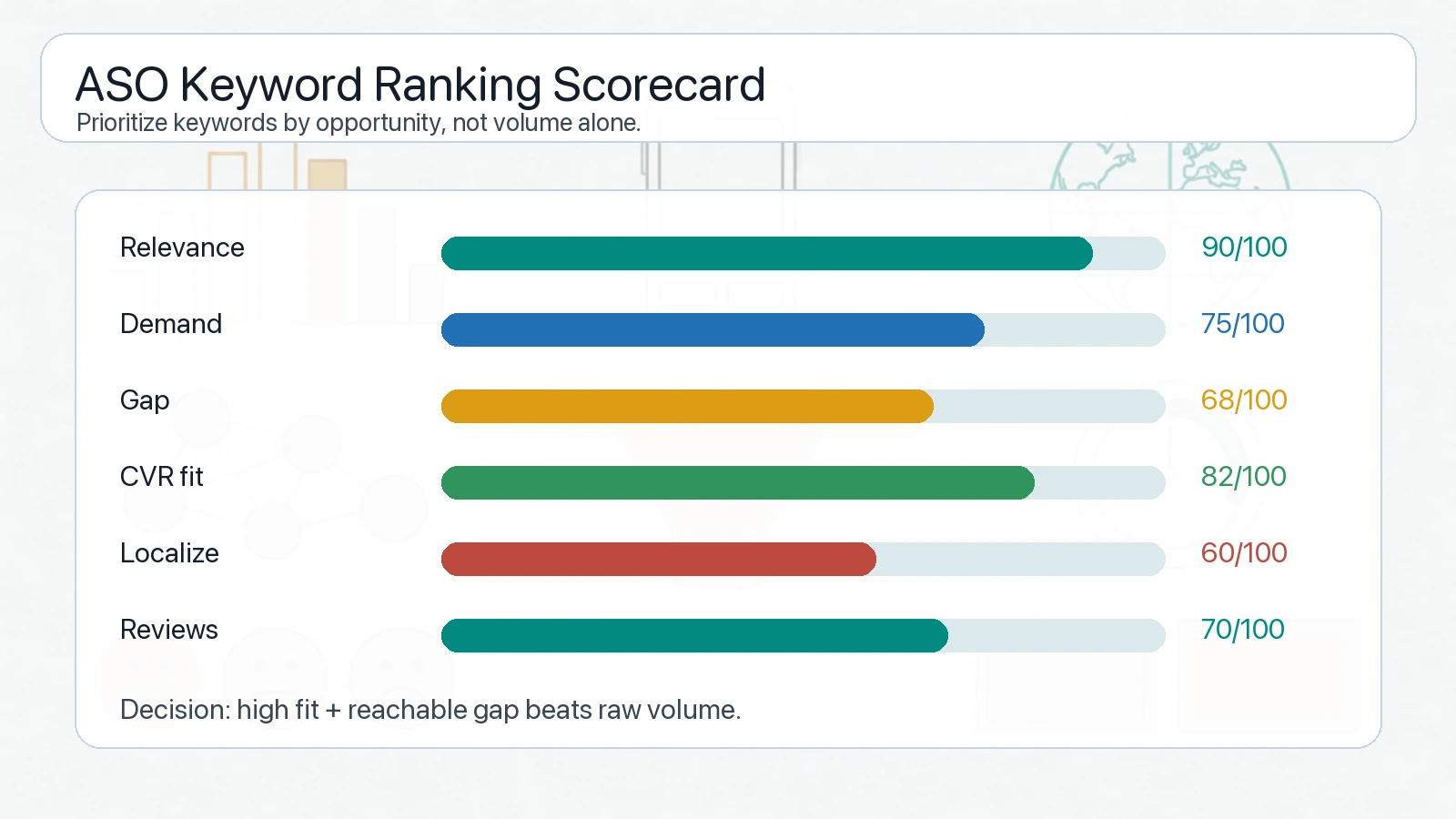 A useful app store keyword scorecard combines rankings with conversion, localization, reviews, and quality signals.