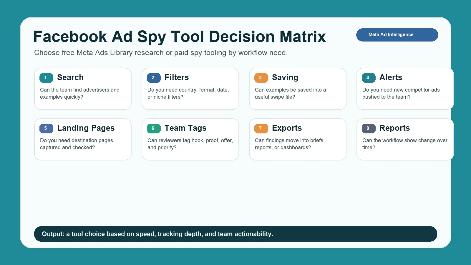 Before buying a Facebook ad spy tool, score the workflow against the way your team actually works.