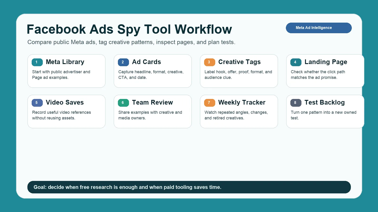 A Facebook ad spy workflow should connect public discovery, creative tagging, landing-page checks, and tests.