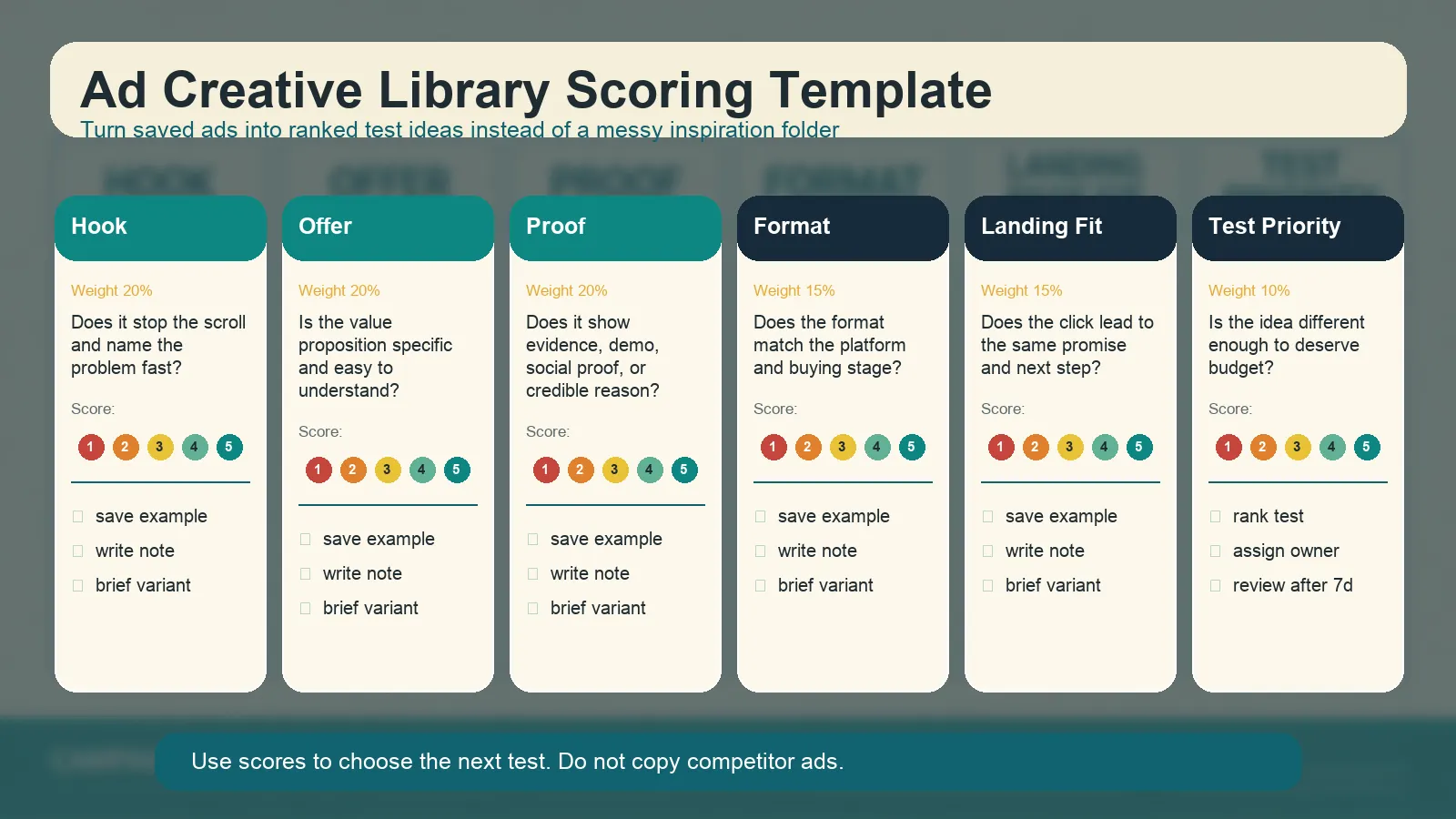 如果只是收藏广告,library 很快会变成杂乱文件夹。只有当你按 hook、offer、proof、format、landing page fit 和 test priority 组织案例时,它才会变成可复用资产。它能支持更快的 brief、更清晰的 creative review,也能让 ad creative AI prompt 更具体。