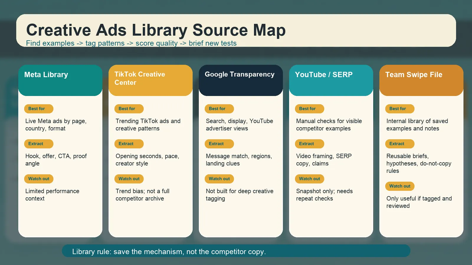 真正有用的 creative ads library,会把公开广告库、平台研究工具和团队自己的 tagged swipe file 连接起来。
