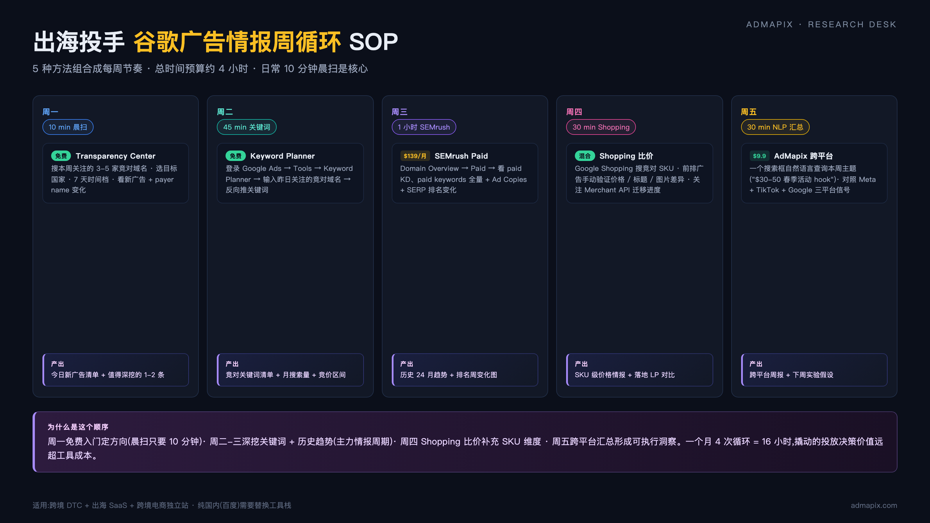 给个工具组合的最小可行方案:个人站长 / 小卖家(月预算 < $500)用 Transparency Center + Keyword Planner + AdMapix 起步($9.9/月),够覆盖 70% 需求;成长期出海团队(月预算 $500-5000)加 SEMrush Pro($117.33/月年付),5 个核心对手做到周度跟踪;成熟跨境品牌(月预算 $5000+)再加 SEMrush Business + BigQuery 程序化批量监控 100+ 对手。不要一上来就买全套,按预算阶梯渐进上工具,把钱花在刀刃上。