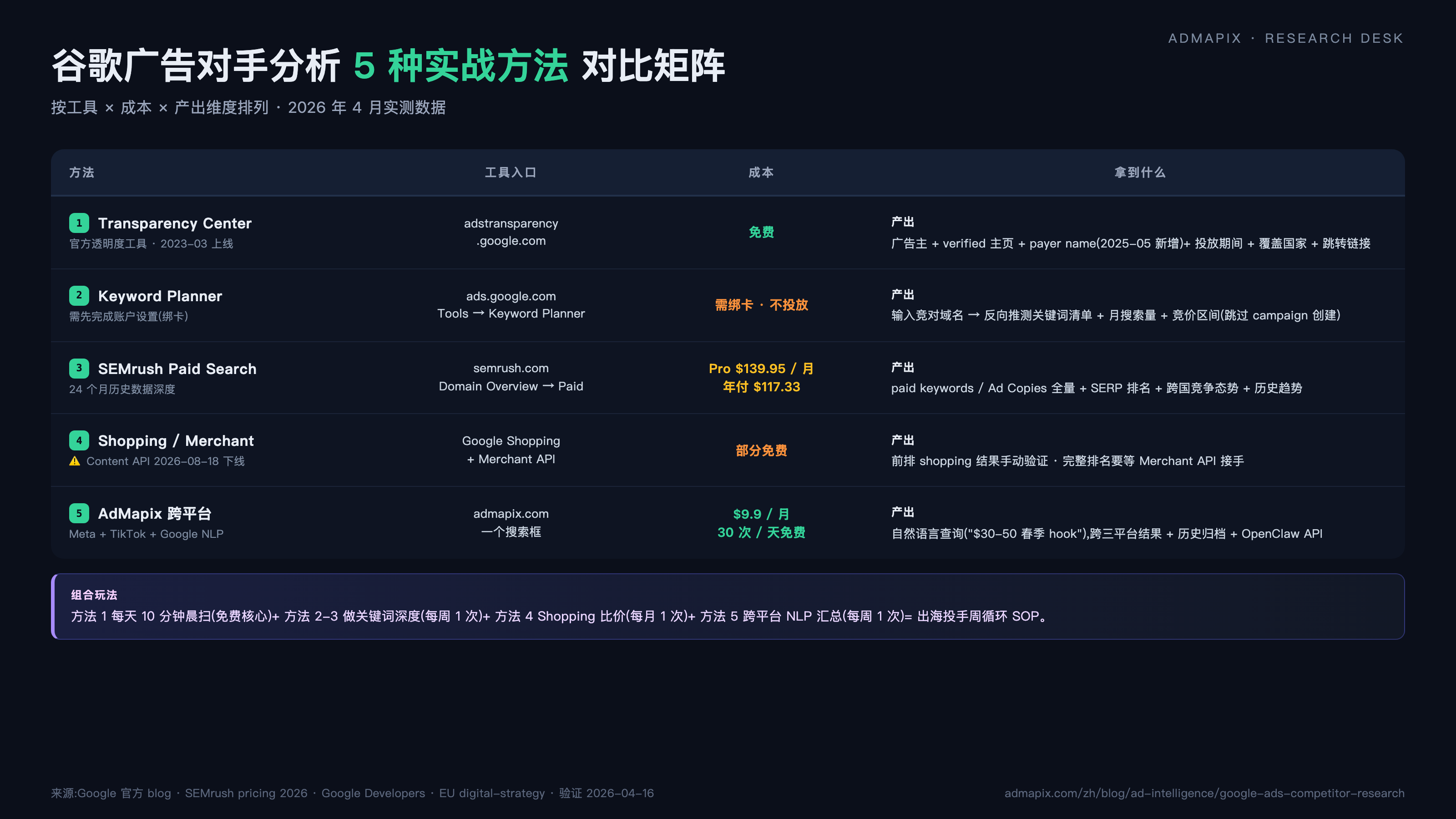 接下来 4800 字左右,我会给你 5 种实战方法(免费的官方渠道到月付 $499.95 的 SEMrush Business)、Transparency Center 中文 7 步实操、以及 2026 年 4 月最新核查的 4 个差异点:① 格式筛选只有 text/image/video 三项,Shopping 没有独立选项;② Keyword Planner 免费用但必须绑卡完成账户设置;③ SEMrush Pro 实价 $139.95/月而不是水文里抄的 $119;④ Content API for Shopping 2026-08-18 下线、Merchant API 接手。看完这篇你会知道每周该用哪几个工具、怎么组合、什么场景该选谁。