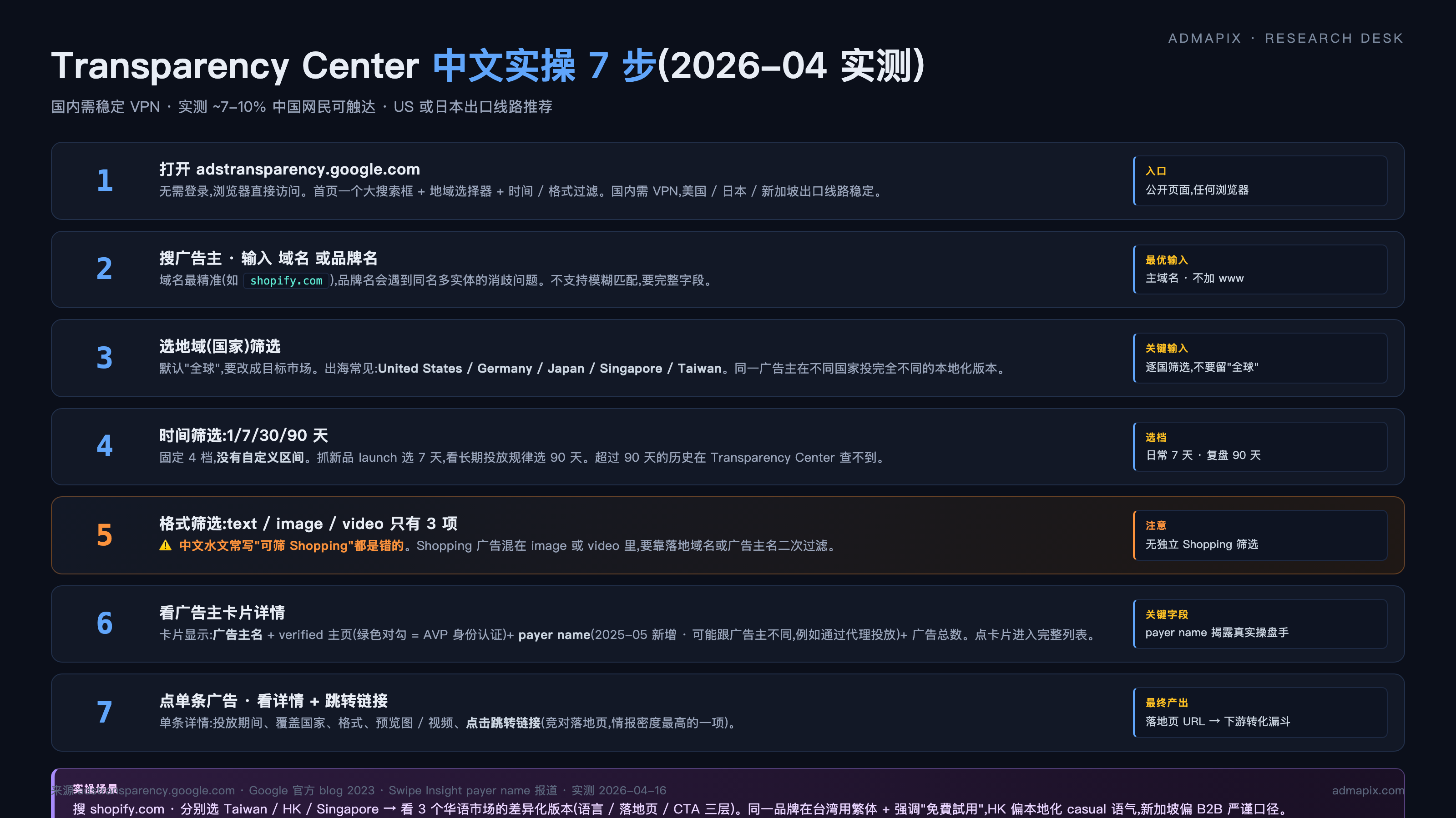 中文市场缺这个流程缺得很厉害 — 现在搜"谷歌广告信息公开中心",前 10 个结果里 80% 是 2023 年 3 月刚上线时的机翻,完全没覆盖 2024-2026 的所有更新(AVP 覆盖扩张、payer name 字段、EU DSA 报告模板、2026 年 2 月起 PMax Search Partner 在 Center 里可见)。这导致一个荒诞的现象:中文出海团队抄中文教程,结果整个流程跟实际 UI 对不上,白浪费半小时 debug。下面这套是我 2026 年 4 月用 US IP 实测的最新流程,直接照做就行: