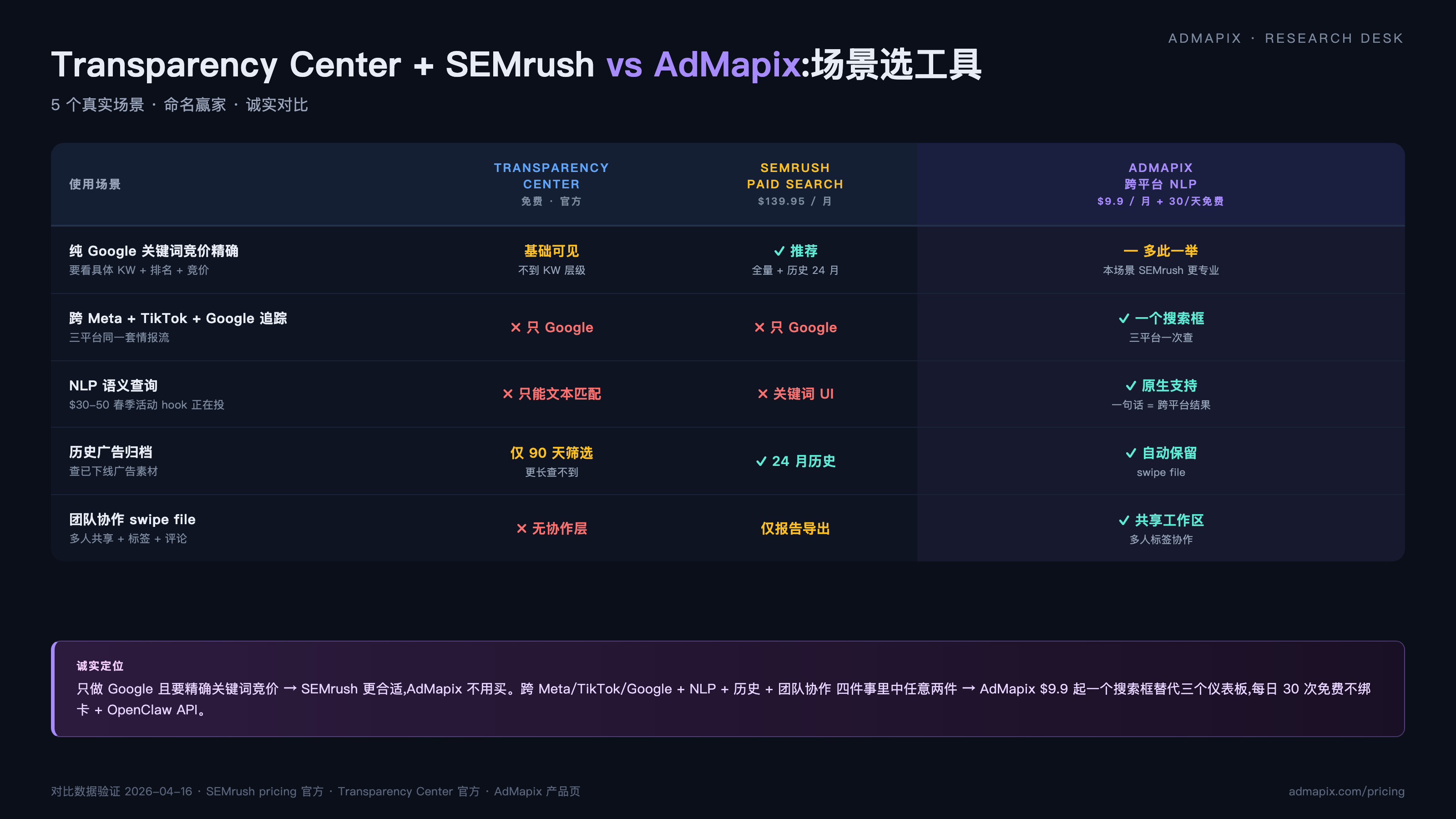 | 场景 | Transparency Center + SEMrush | AdMapix |