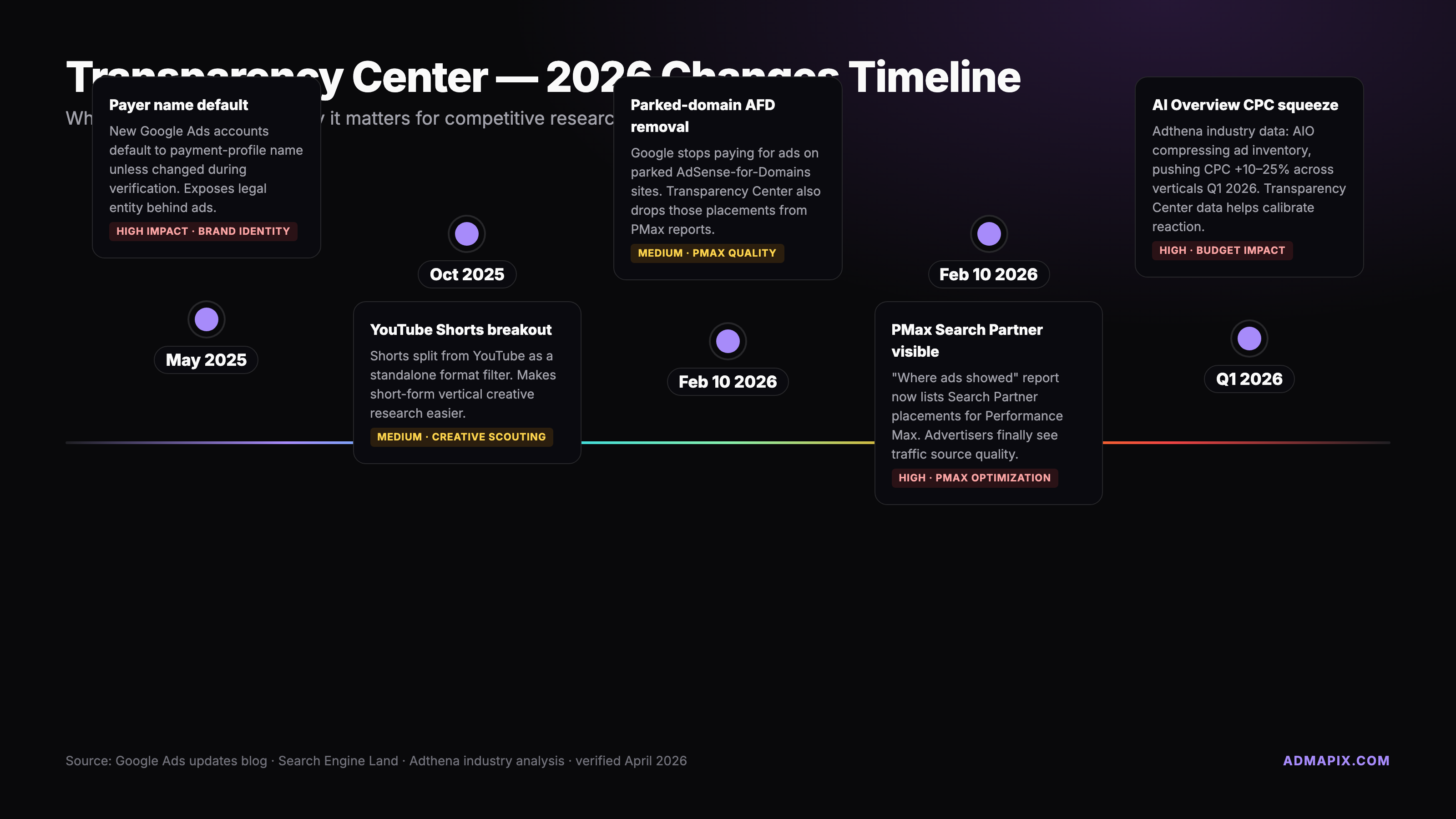 Google 广告透明度中心地址 **https://adstransparency.google.com/**,免费、公开、不用登录,能查到任意认证广告主近期在 Search / Shopping / Display / YouTube / Maps / Play 投的所有广告。这是 Google 官方的广告公开档案,也是 2026 年每个出海投手、跨境电商运营、品牌安全团队必备的监控工具——尤其是 2025-2026 连着三波重大更新落地之后:Payer name 默认显示全面推开、PMax Search Partner 投放位置首次可见(2026-02-10 生效)、AI Overview 把搜索 CPC 抬高 10-25%。
