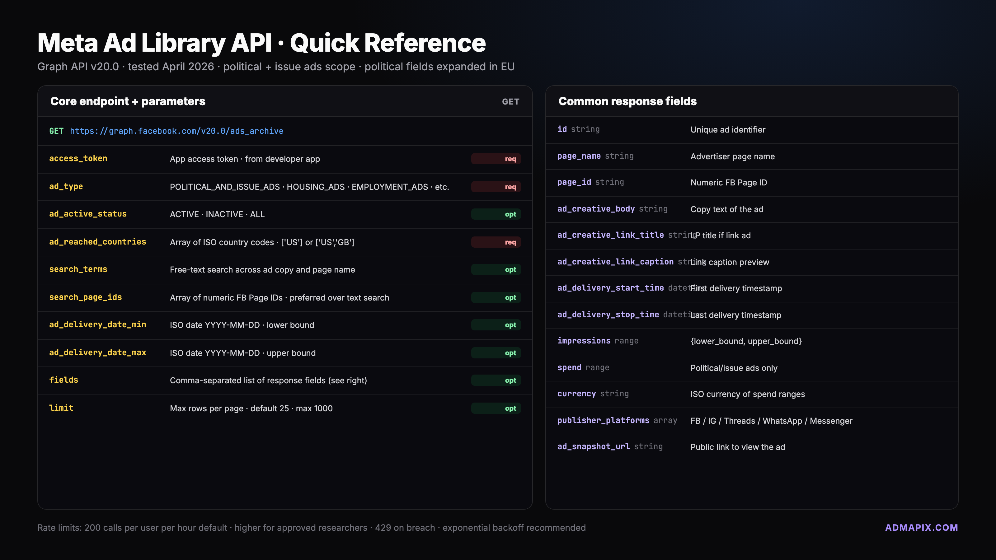 API 走的是 https://graph.facebook.com/v20.0/ads_archive,返回 纯 JSON,没有创意图片和视频的直链(只给 ad_snapshot_url 嵌入页),关键是——只覆盖政治和社会议题广告(political & social-issue ads)。你用 API 查某个 DTC 品牌投的卖货广告,结果一条不返回——不是 bug,是覆盖范围根本不包括。这一点 Meta 官方文档写得非常隐晦,很多开发者折腾半天才反应过来:原来我查的关键词不在政治议题范畴,所以 API 一条不给。
