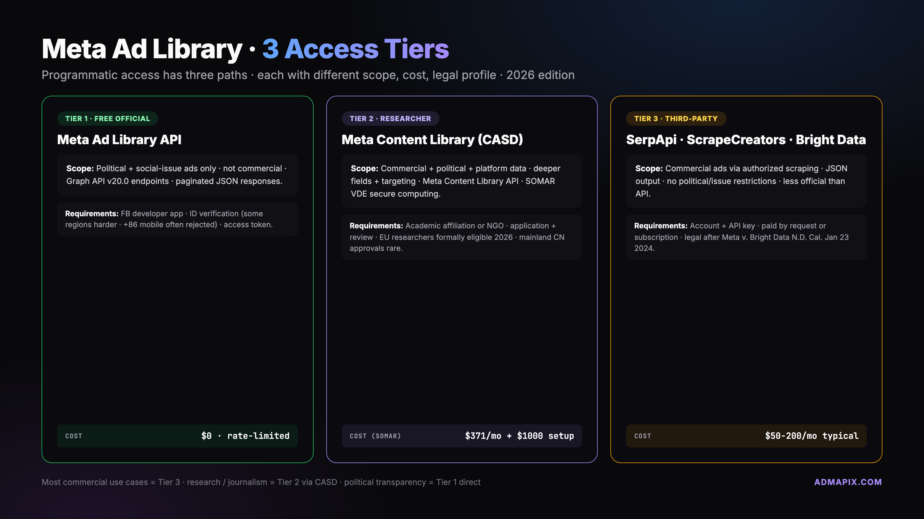 /ads_archive):免费、任何开发者都能申、只覆盖政治议题广告、返回 JSON、无原素材 - Content Library:收费($371/月)、要 CASD 审核、覆盖所有广告包括商业、数据在 SOMAR VDE 沙箱内分析、不能下载本地