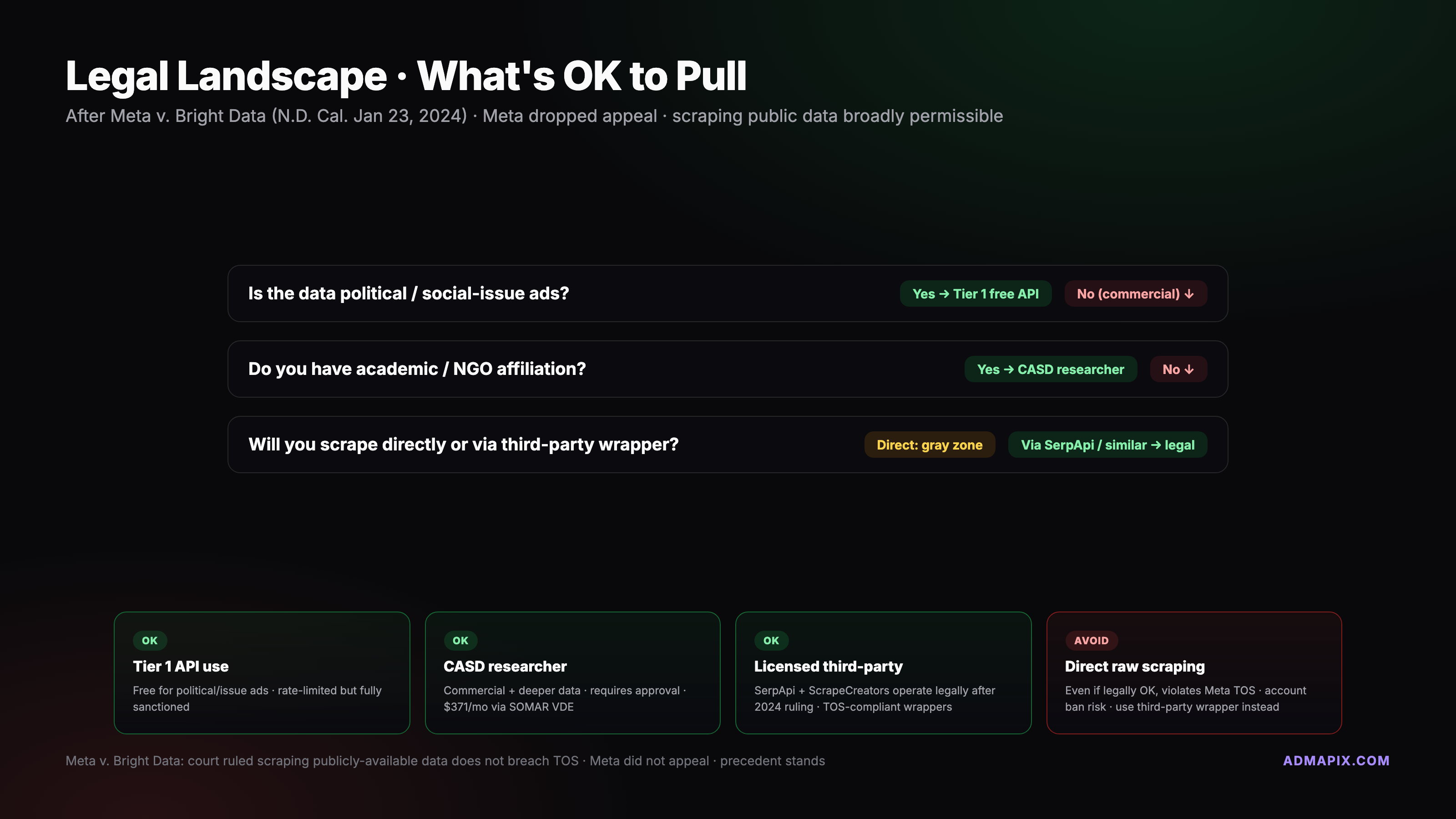灰区缩小但没完全合法。加州北区联邦地院 2024-01-23 支持了 Bright Data 对 logged-off 公开数据的抓取主张,Meta 2024-02-26 撤诉且未上诉到第九巡回法院,所以这不是终审先例,只在 N.D. Cal. 有约束力。其他法院仍可能作出相反判决。企业级合规使用,建议上专业律师。