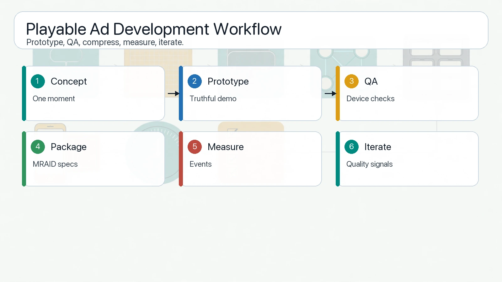 Playable ads development workflow 需要 concept validation、prototype control、technical QA、compression、MRAID readiness 和 launch measurement。