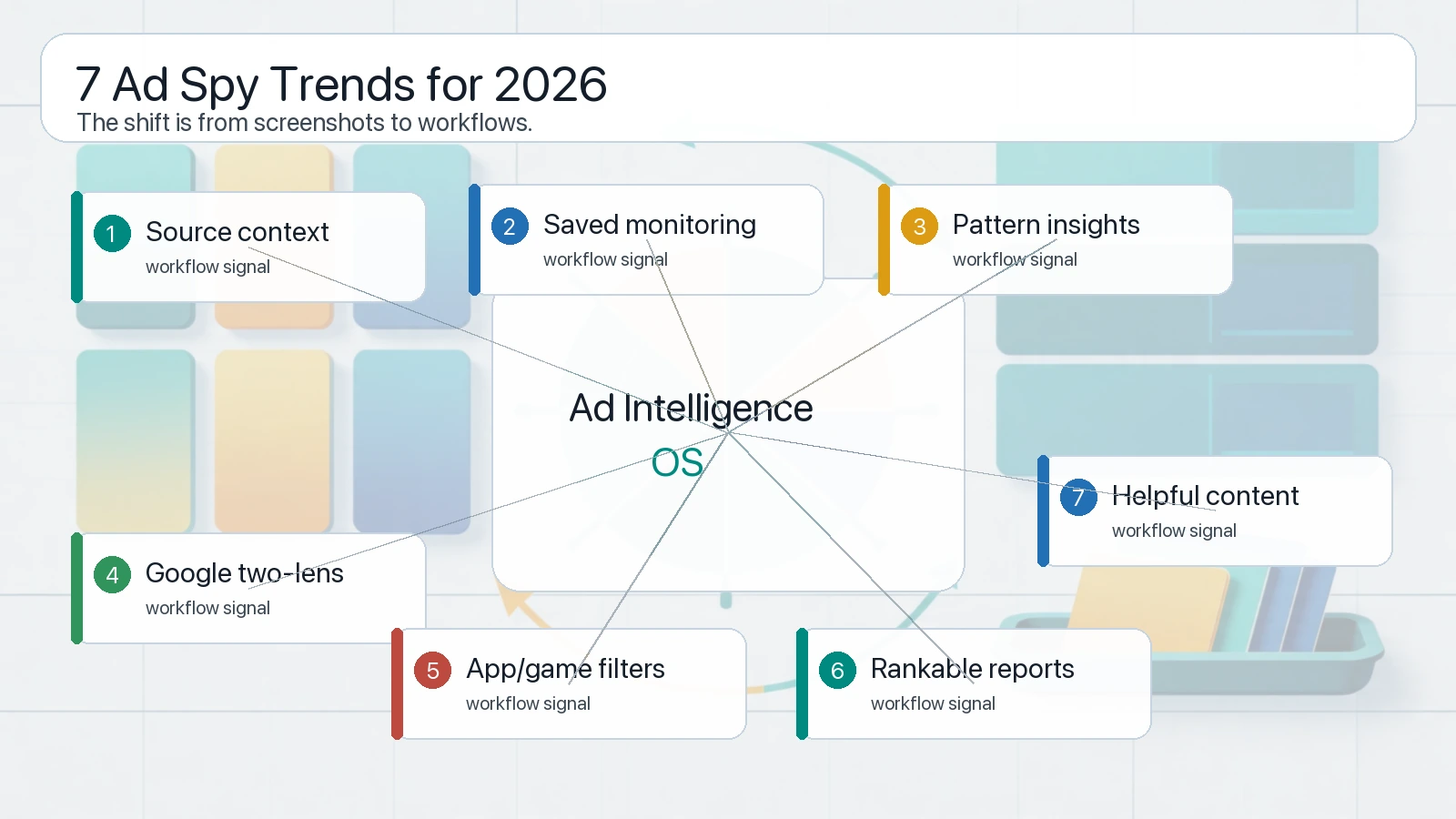 2026 最强的 ad spy trends 其实是 workflow trends:source context、saved reports、vertical filters 和 testable briefs。