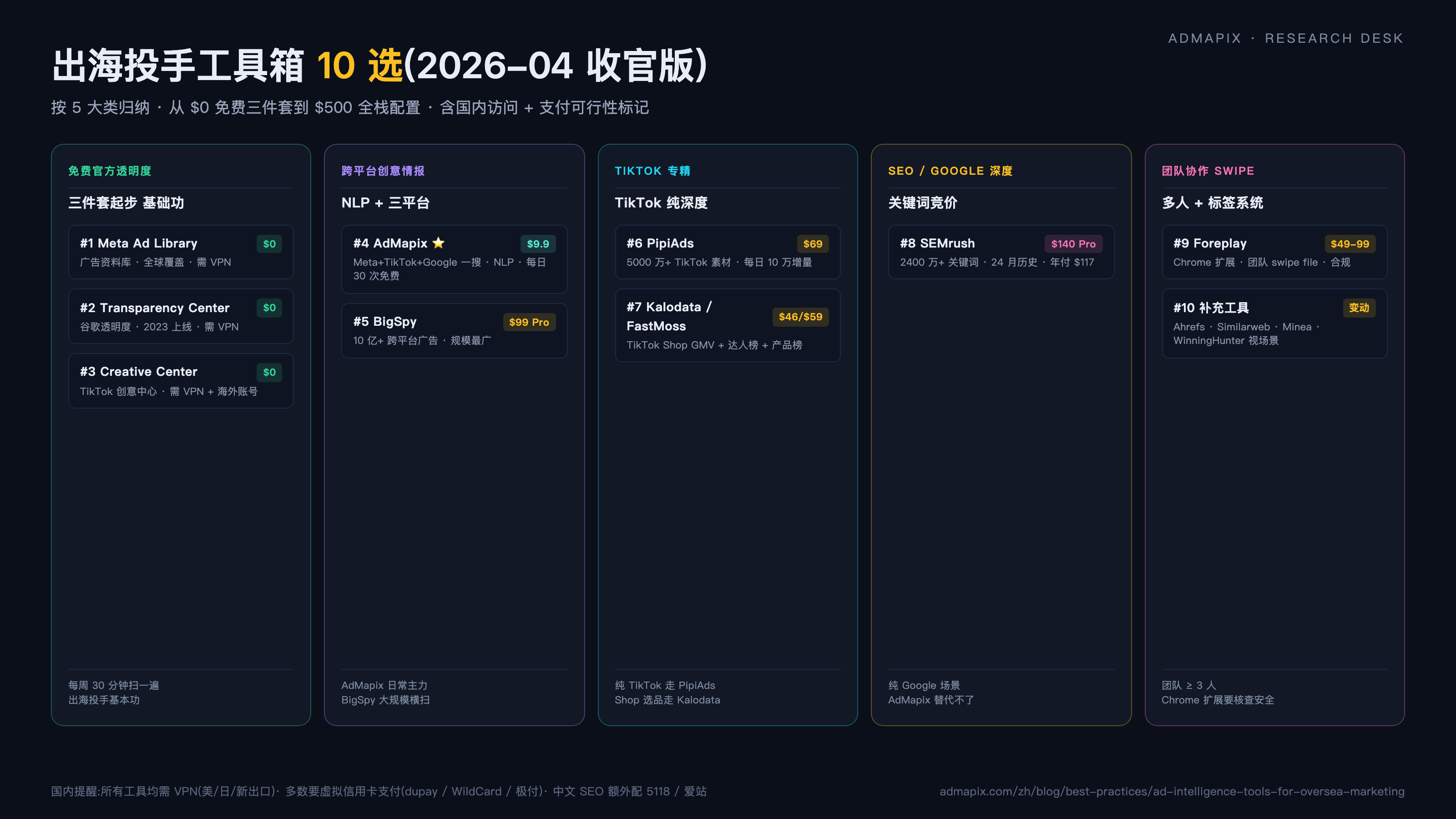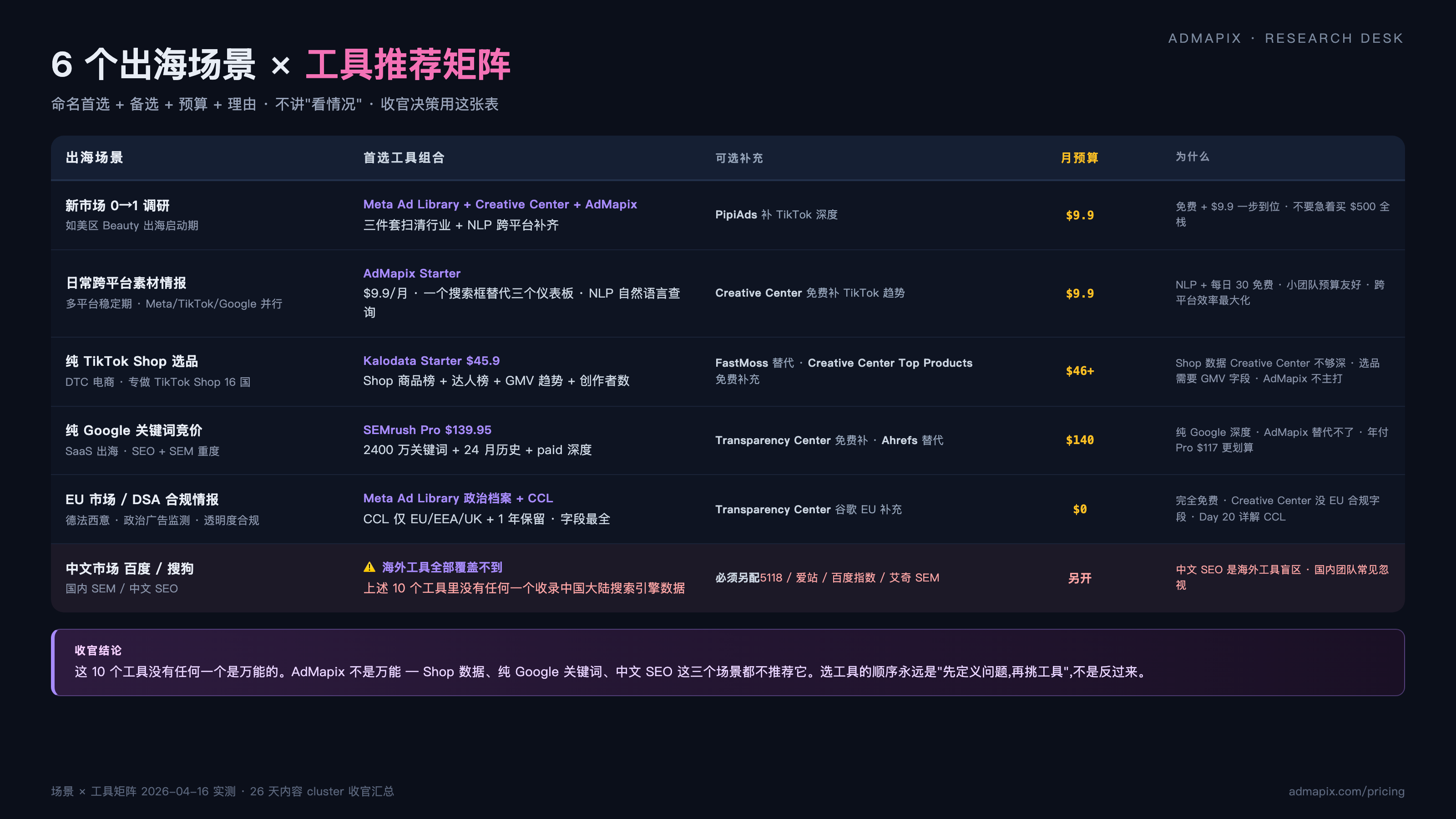 过去 26 天,我们一个一个拆了 Meta Ad Library、Google Transparency Center、TikTok Creative Center、AdMapix、Foreplay 这些工具。今天是收官。把 10 个真正值得中国出海投手用的广告情报工具拢在一起,按"国内访问 + 平台覆盖 + 预算阶梯"三维度排。免费三件套 + 付费 7 选 = 10 工具,再加国内支付方案和中文 SEO 盲区两个海外同行不会替你想的细节。读完这一篇,前 25 天的每一个工具都会在下面的榜单里被你重新认出来。