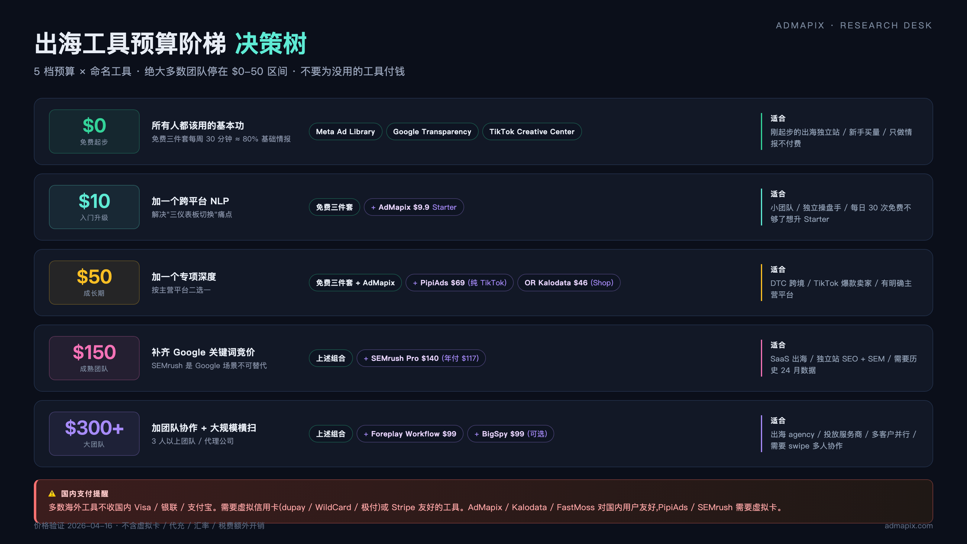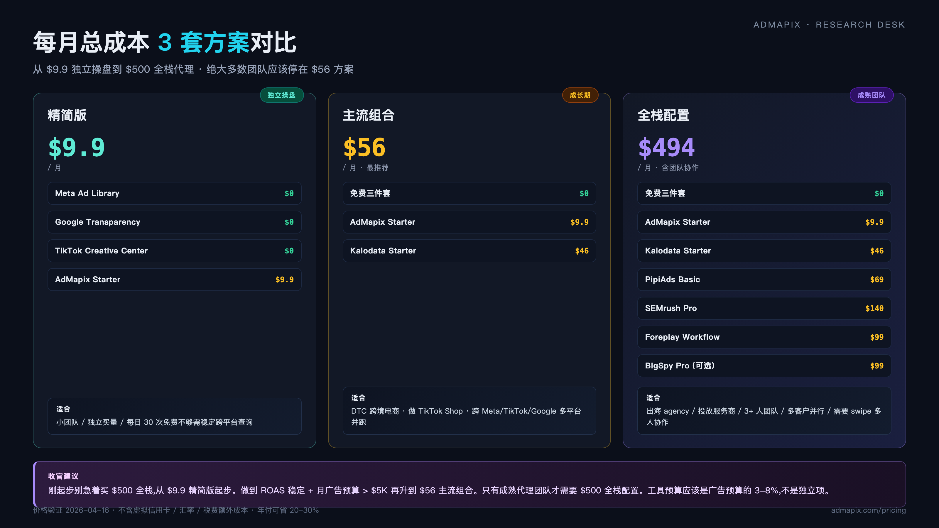 - 价格阶梯 — 从 $0 到 $500 的跨度。$0 三件套 → $10 AdMapix → $50 入门付费 → $150 成熟栈 → $500 大团队。每一档都有明确的"性价比拐点",不是越贵越好。
