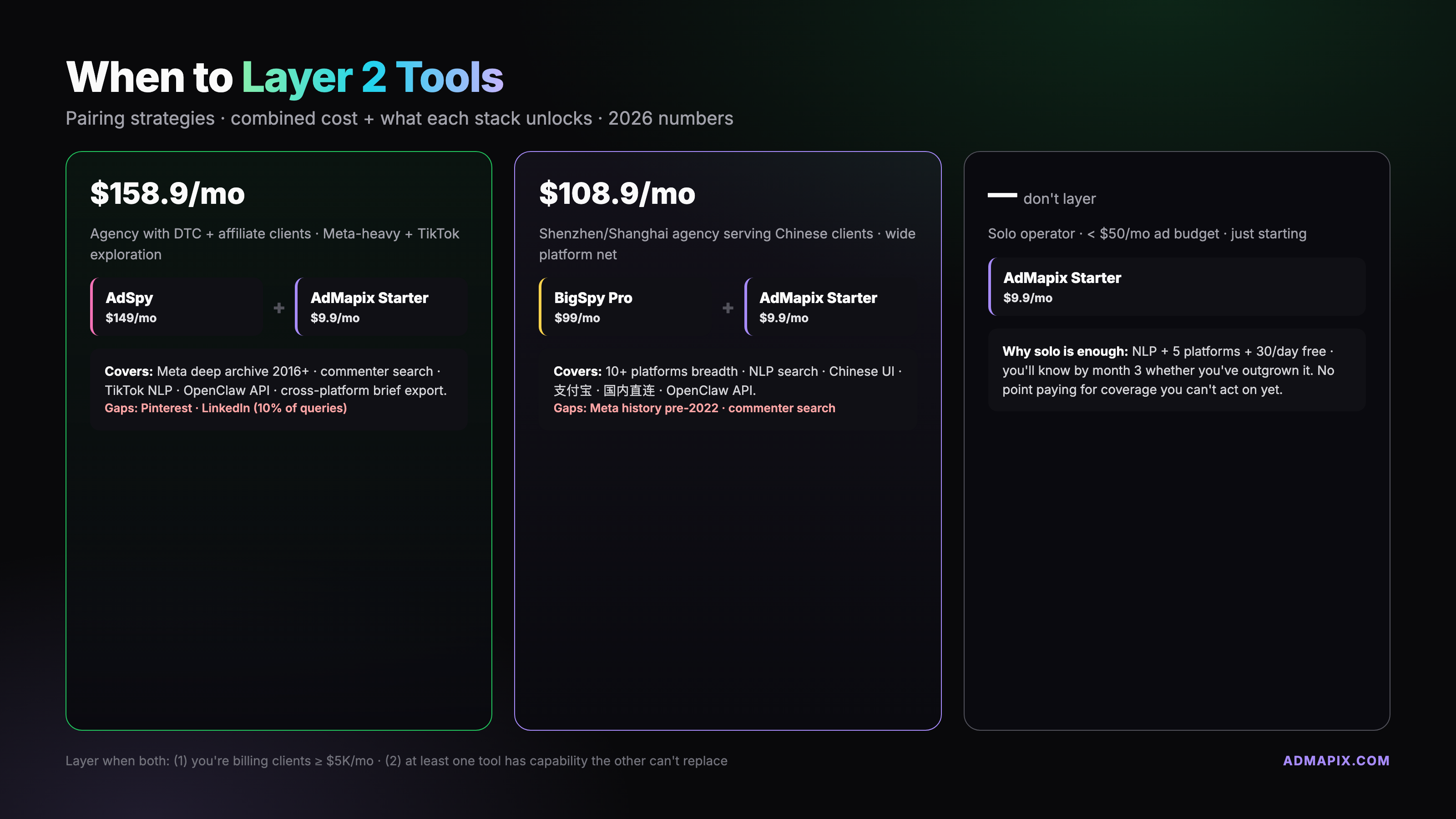 可以,而且推荐。上一节讲的 2 工具叠加(AdSpy+AdMapix $158.9 或 BigSpy+AdMapix $108.9)是大多数中型投手的最优解。一款工具的盲区,另一款补位。绝大部分 agency 都在用 2-3 款工具组合,不是单一工具包打天下。
