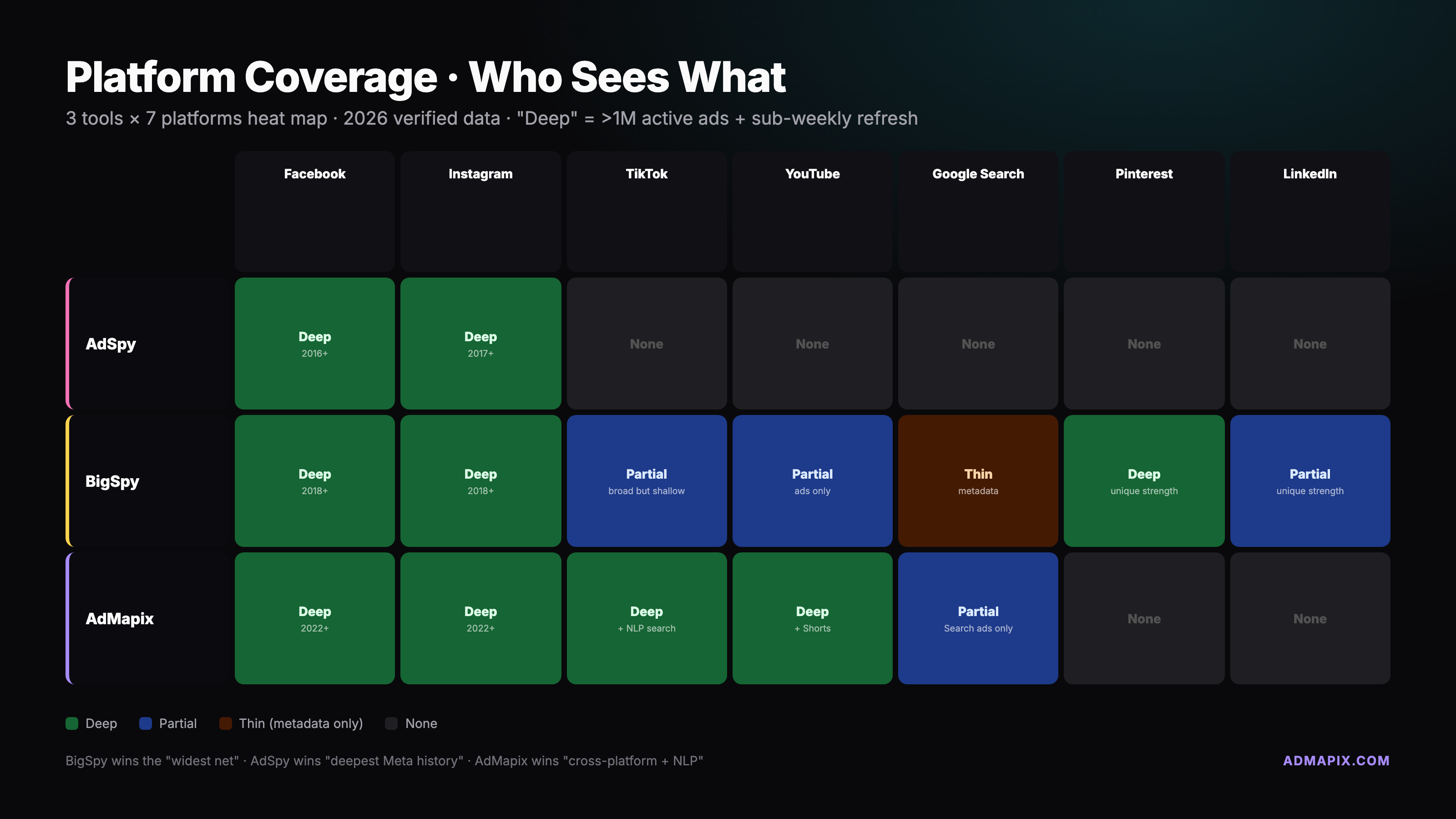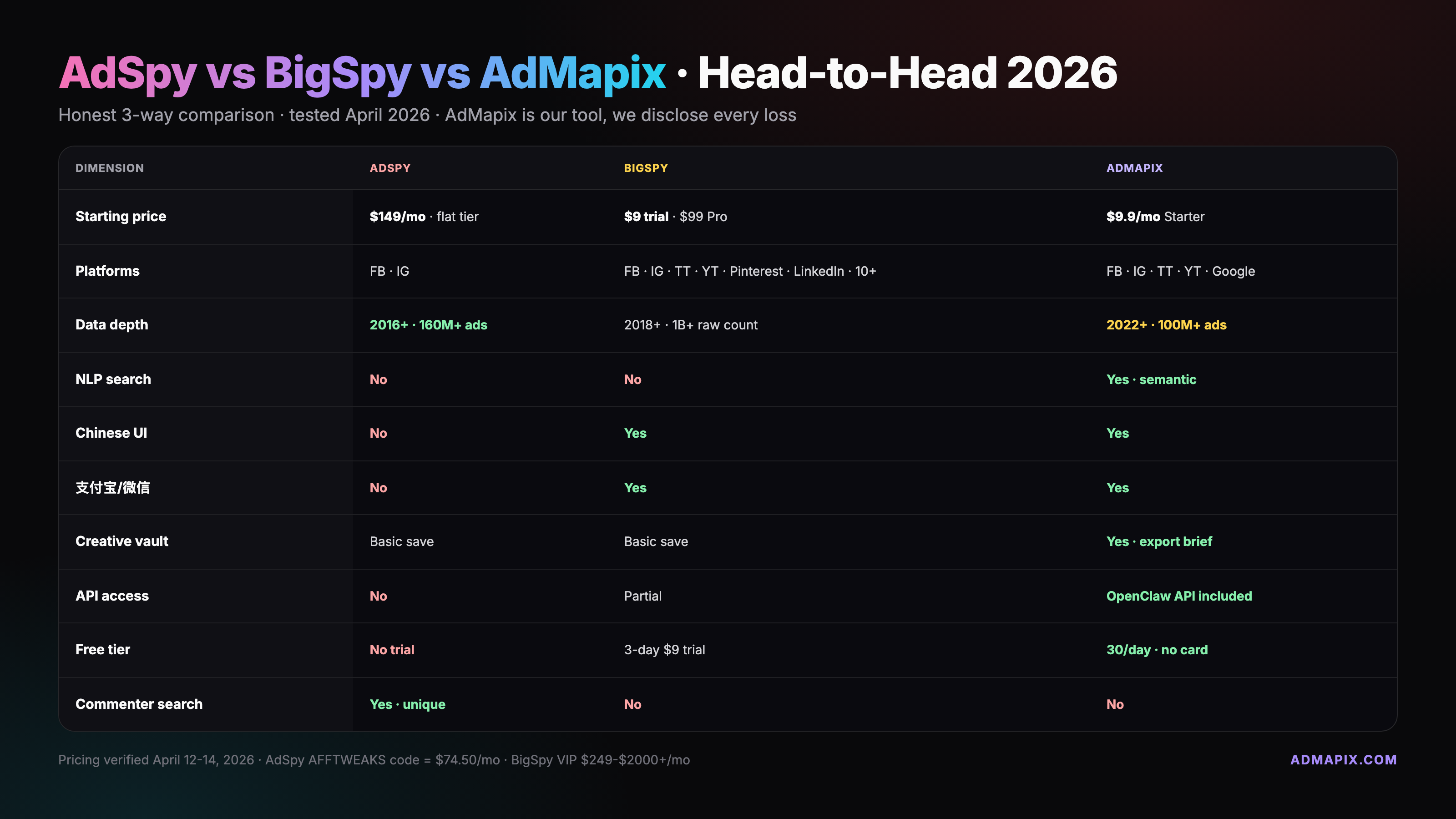 作者:AdMapix 编辑部 · 2026 年 4 月更新 诚实披露:AdMapix 是本站自家产品。凡是 AdSpy 或 BigSpy 比我们强的地方(Meta 历史深度、评论搜索、Pinterest/LinkedIn 覆盖、原始广告数量),文里会直说,不藏。