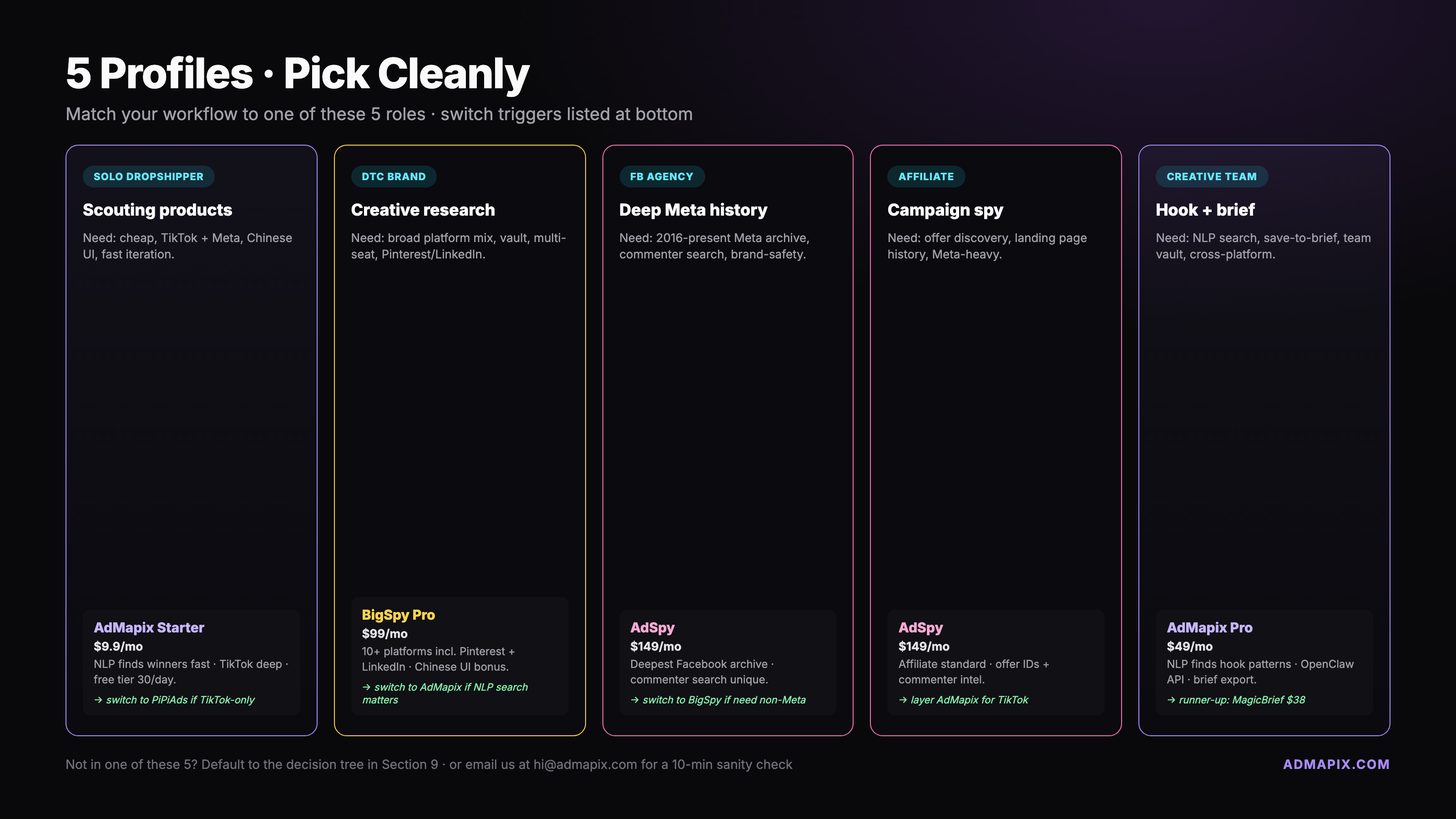 Verdict:跑 Meta 老 case 研究——AdSpy。要铺多平台——BigSpy。主打 TikTok/YouTube 短视频生态——AdMapix。