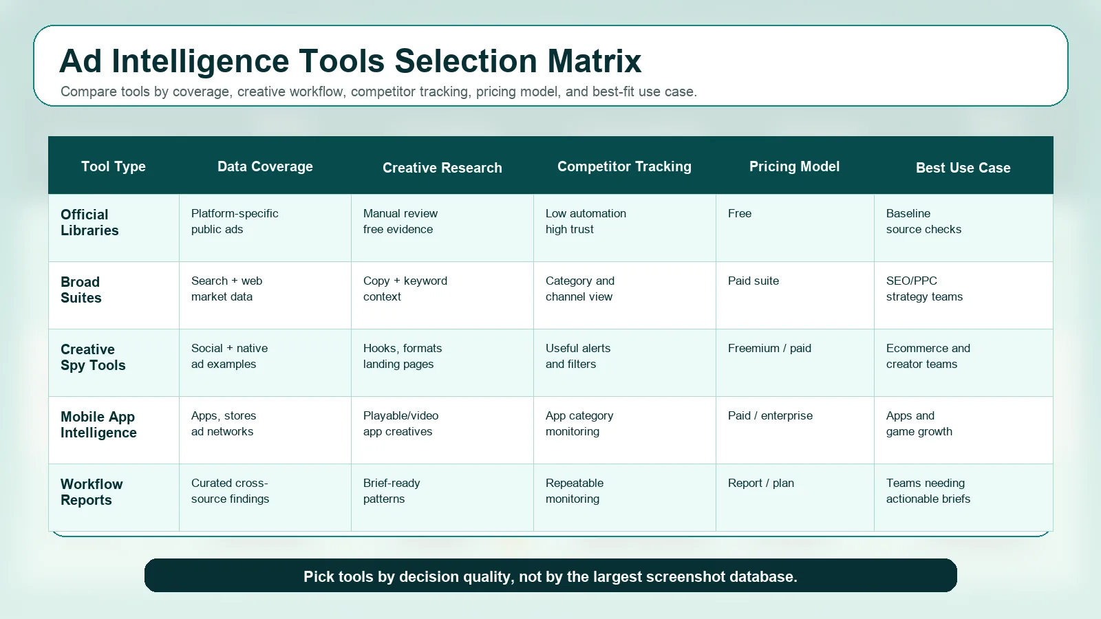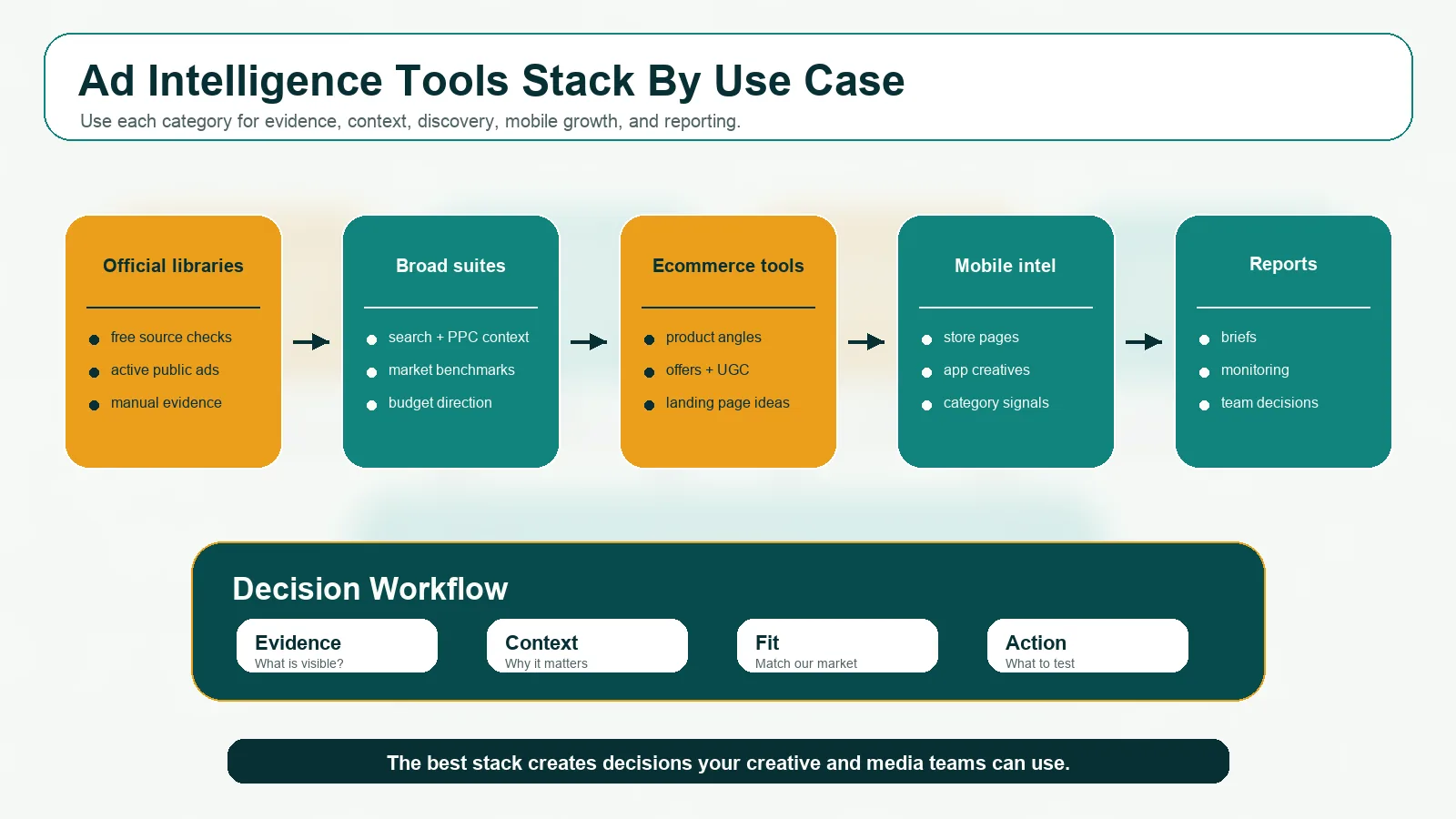用免费官方来源做验证,用 broad suites 补市场和 PPC 上下文,用 creative spy tools 找案例,用 mobile intelligence 处理 app 生态,用 reporting workflows 把研究变成 brief 和决策。