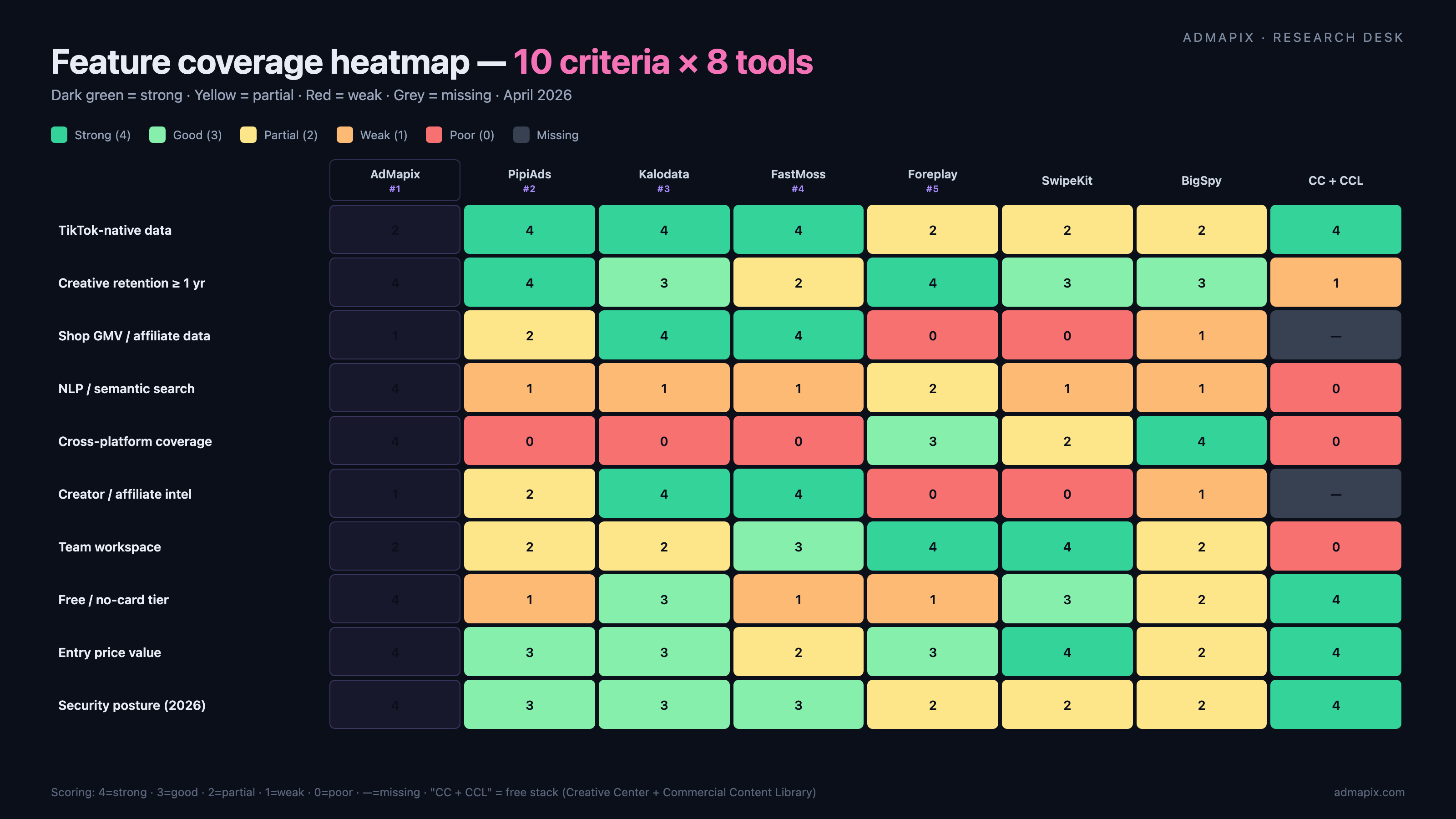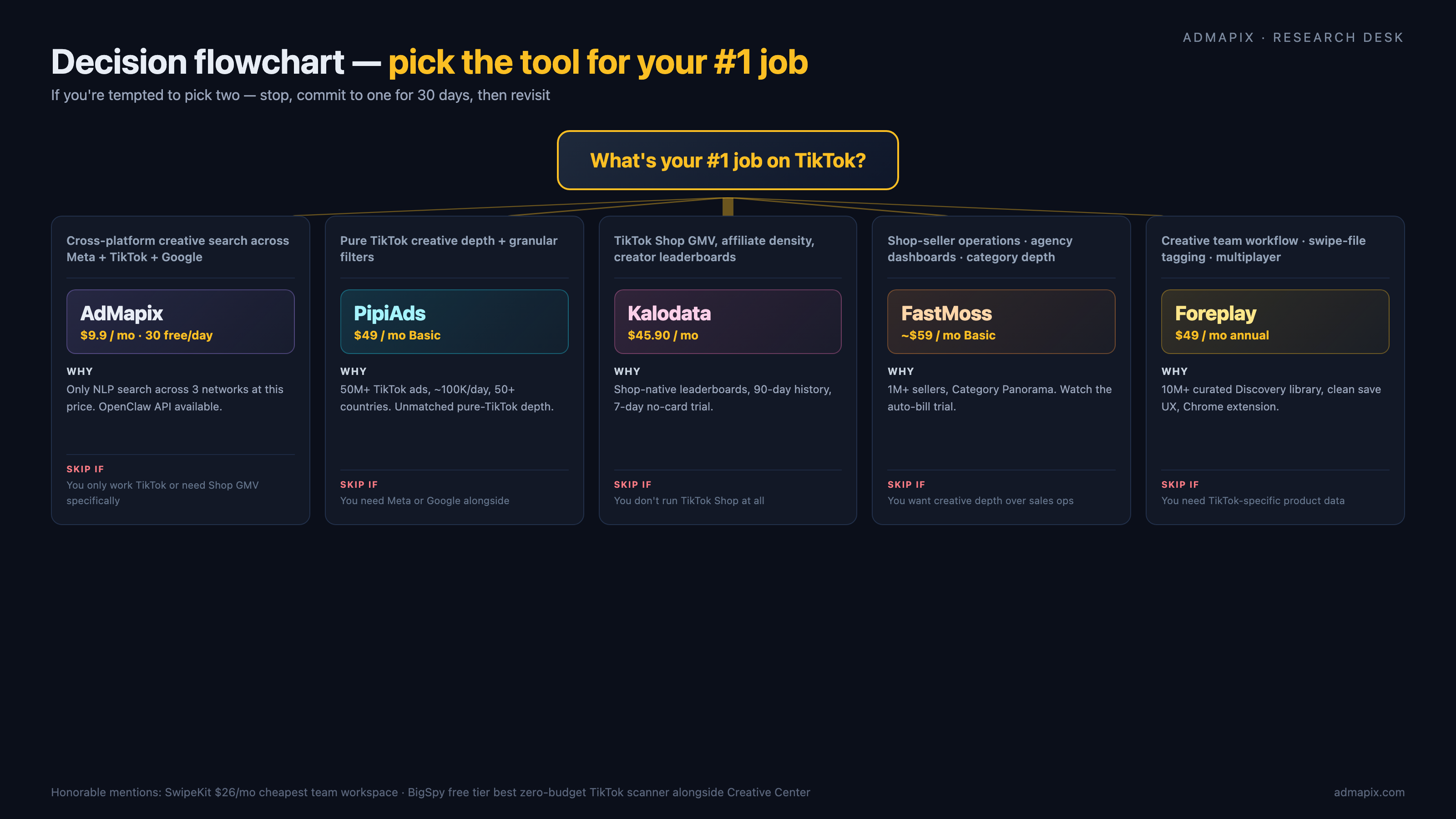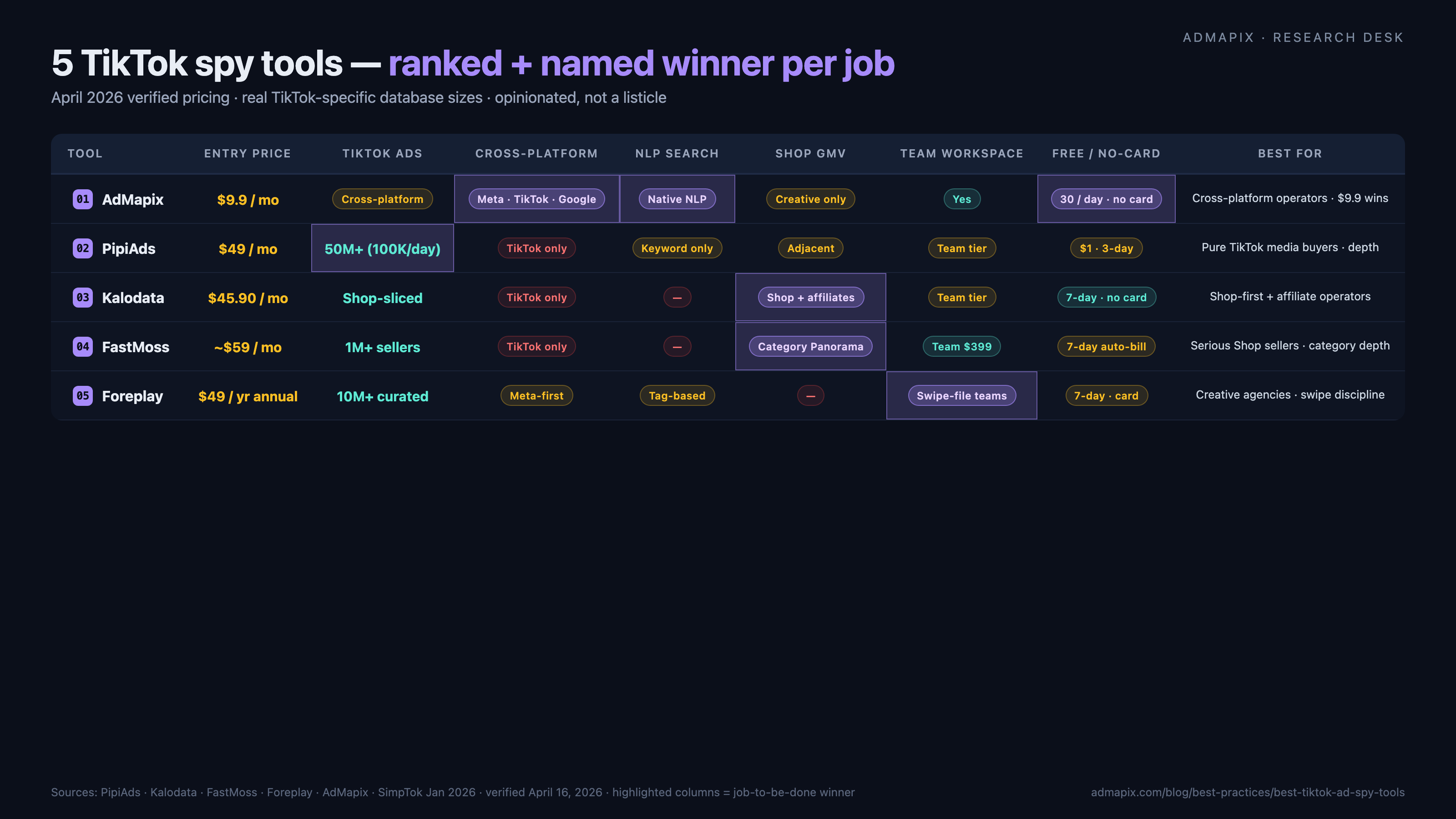 5 款 TikTok 广告监控工具对比矩阵 — AdMapix / PipiAds / Kalodata / FastMoss / Foreplay 七维能力 + 场景赢家高亮