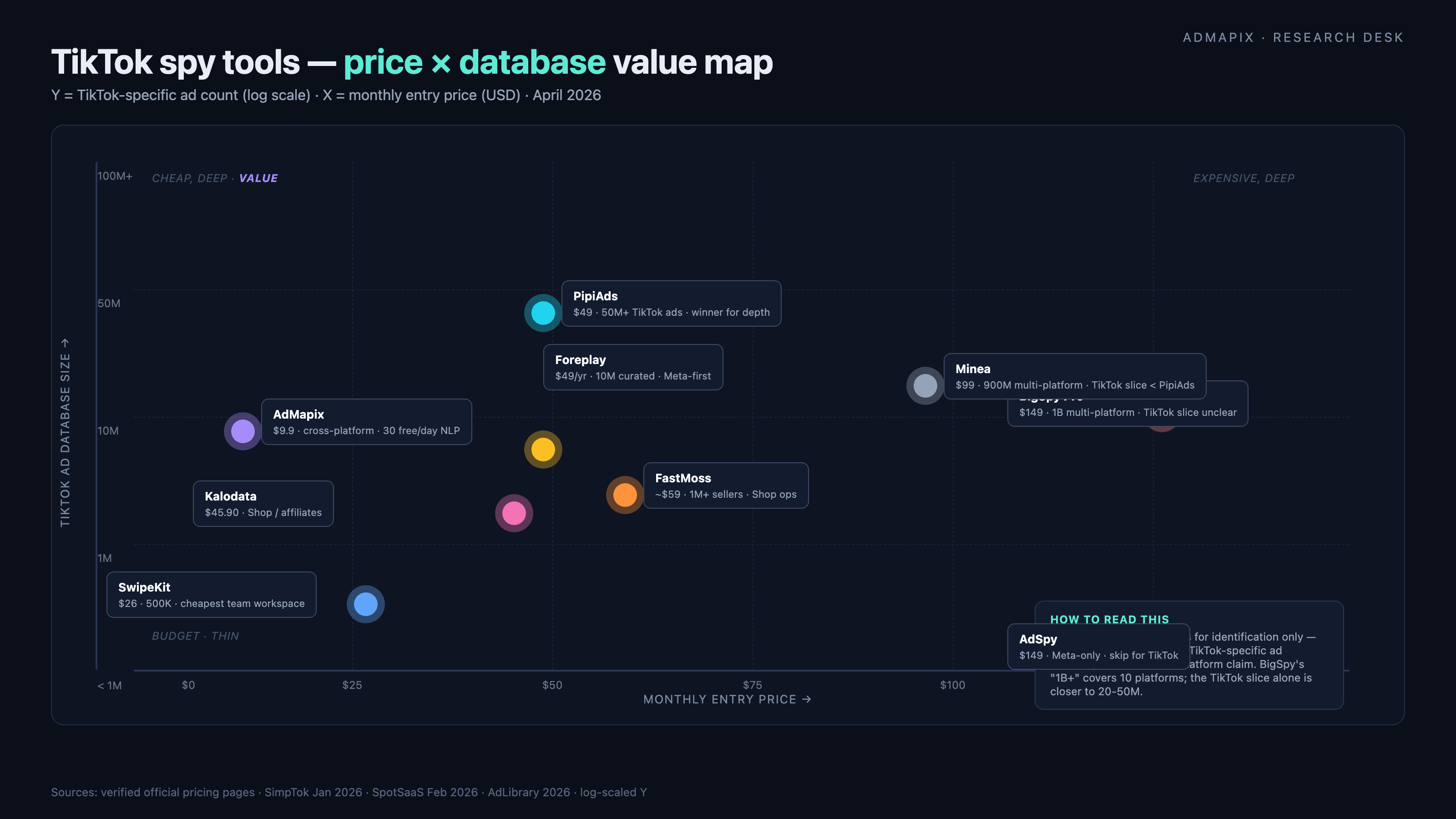 TikTok 监控工具价格 × 专项广告库规模散点图 — PipiAds 深度冠军、AdMapix 最便宜、SwipeKit 性价比